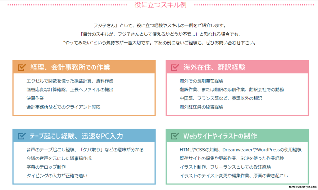 フジ子さんの公式HPにも必須スキルとして次のような項目が挙げられています。