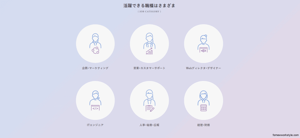 企画・マーケティング、営業・カスタマーサポート、Webディレクタ・デザイナー、ITエンジニア、人事・秘書・広報、経理・財務など。
